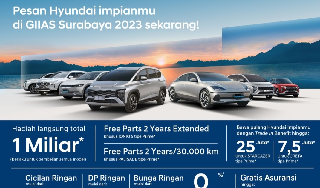 * Hyundai memanjakan pengunjung GIIAS Surabaya 2023 dengan promo menarik seperti cicilan, DP, dan bunga ringan, gratis garansi, hingga hadiah total Rp1 miliar.